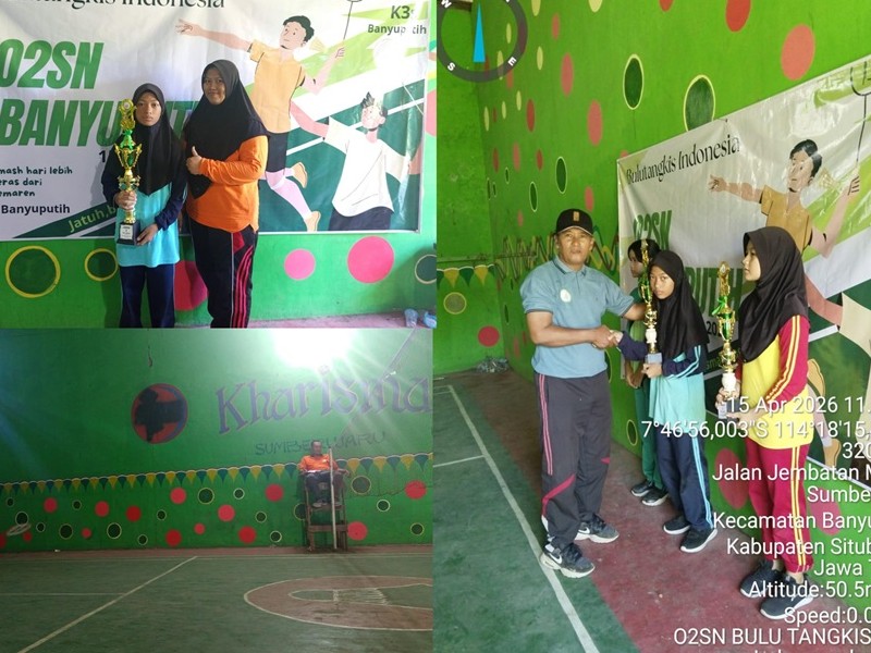 Ananda Boy Januar dan Labiba Nasjmi Humairoh mengikuti kegiatan Olimpiade Olahraga Siswa Nasional (O2SN) cabang olahraga Bulutangkis/Badminton yang diselenggarakan oleh KKG PJOK Kecamatan Banyuputih pada Selasa, 14 April 2026.